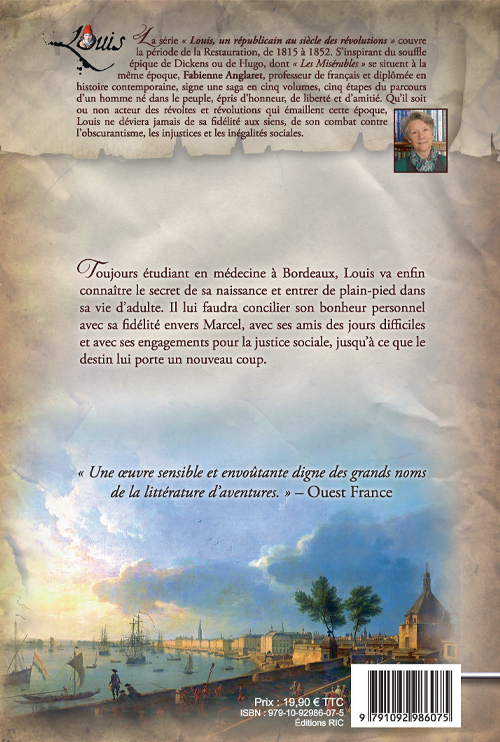 La série « Louis, un républicain au siècle des révolutions » couvre la période de la Restauration, de 1815 à 1852. S’inspirant du souffle épique de Dickens ou de Hugo, dont « Les Misérables » se situent à la même époque, Fabienne Anglaret, professeur de français et diplômée en histoire contemporaine, signe une saga en cinq volumes, cinq étapes du parcours d’un homme né dans le peuple, épris d’honneur, de liberté et d’amitié. Qu’il soit ou non acteur des révoltes et révolutions qui émaillent cette époque, Louis ne déviera jamais de sa fidélité aux siens, de son combat contre l’obscurantisme, les injustices et les inégalités sociales.